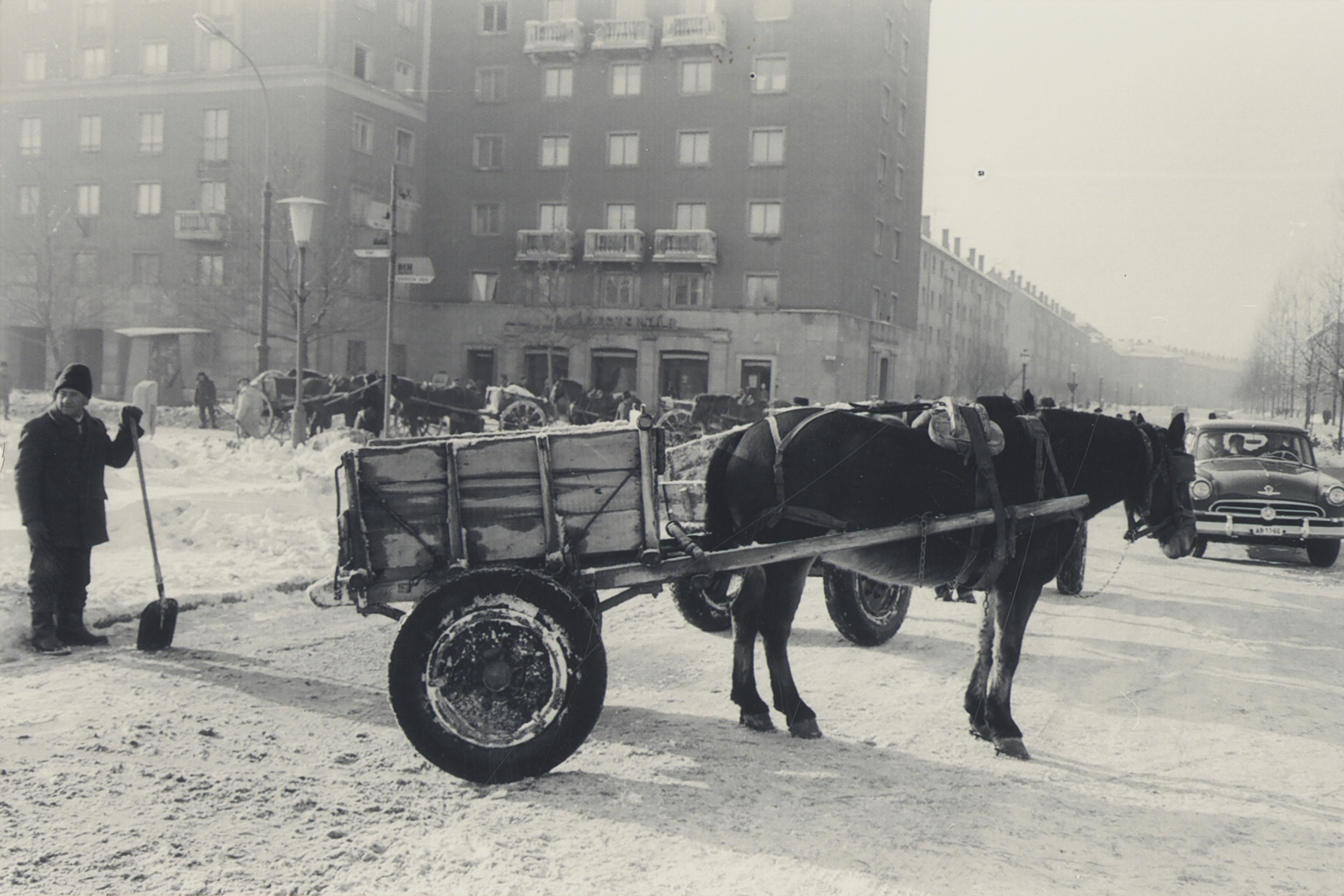 A hó eltakarítása a dunaújvárosi Vasmű út és a Kossuth Lajos utca kereszteződésében – Dokumentációs Központ/Fotótár/DTI gyűjtemény